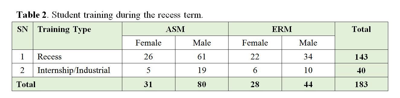 The Faculty of Agriculture and Environmental Science conducted 10 weeks of recess training during Academic Year 2024/2025 (AY 2024/2025), for 143 students (48 female, 95 male). In addition, the Faculty placed 40 students (11 female, 29 male) for industrial training with various partners. The details are presented in Table 2.